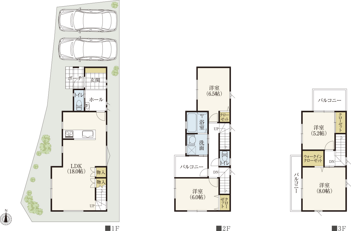 土地面積:114.38㎡(約34.59坪)延床面積:109.17㎡(約33.02坪)1階床面積:40.05㎡ 2階床面積:39.51㎡ 3階床面積:29.16㎡ 木造3階建て 南東向き 4LDK + 駐車スペース2台(5人家族向け)