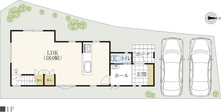 都市部では駐車場を1台確保するのも大変ですが、この敷地形状を活かし、縦列で2台分のカースペースを確保しています。 ご夫婦で車を持つ共働き世帯はもちろん、1台は自家用車、もう1台分は来客用や自転車・バイク置き場として使うなど、都市生活において「敷地内に2台置ける」価値は計り知れません。
