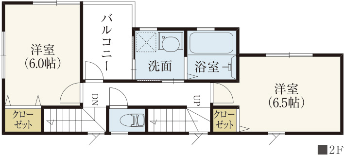 お風呂や洗面所が2階にあることで、1階のLDKに来客があっても、家族はお風呂上がりに気兼ねなく過ごせます。 2階には洋室が2部屋(6.5帖・6.0帖)。子供部屋として最適で、それぞれにしっかり収納を完備。トイレも各階(1F・2F)にあるため、朝の身支度ラッシュ時も安心です。