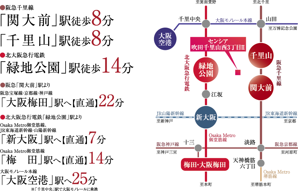 阪急「千里山」「関大前」駅徒歩8分、御堂筋線「緑地公園」駅も使える3駅アクセス。