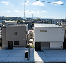 外からの視線が届かない南の山並みに向けて開く外観デザインです。生成りやダークブラウンなど、自然に馴染むトレンドカラーを採用。外観形状は2つの直方体を組み合わせたミニマルデザインです。