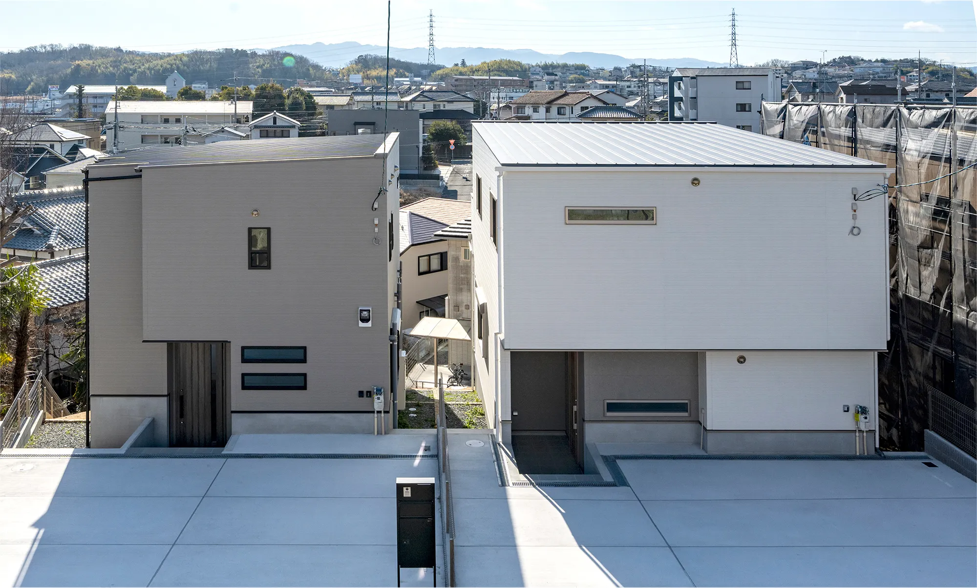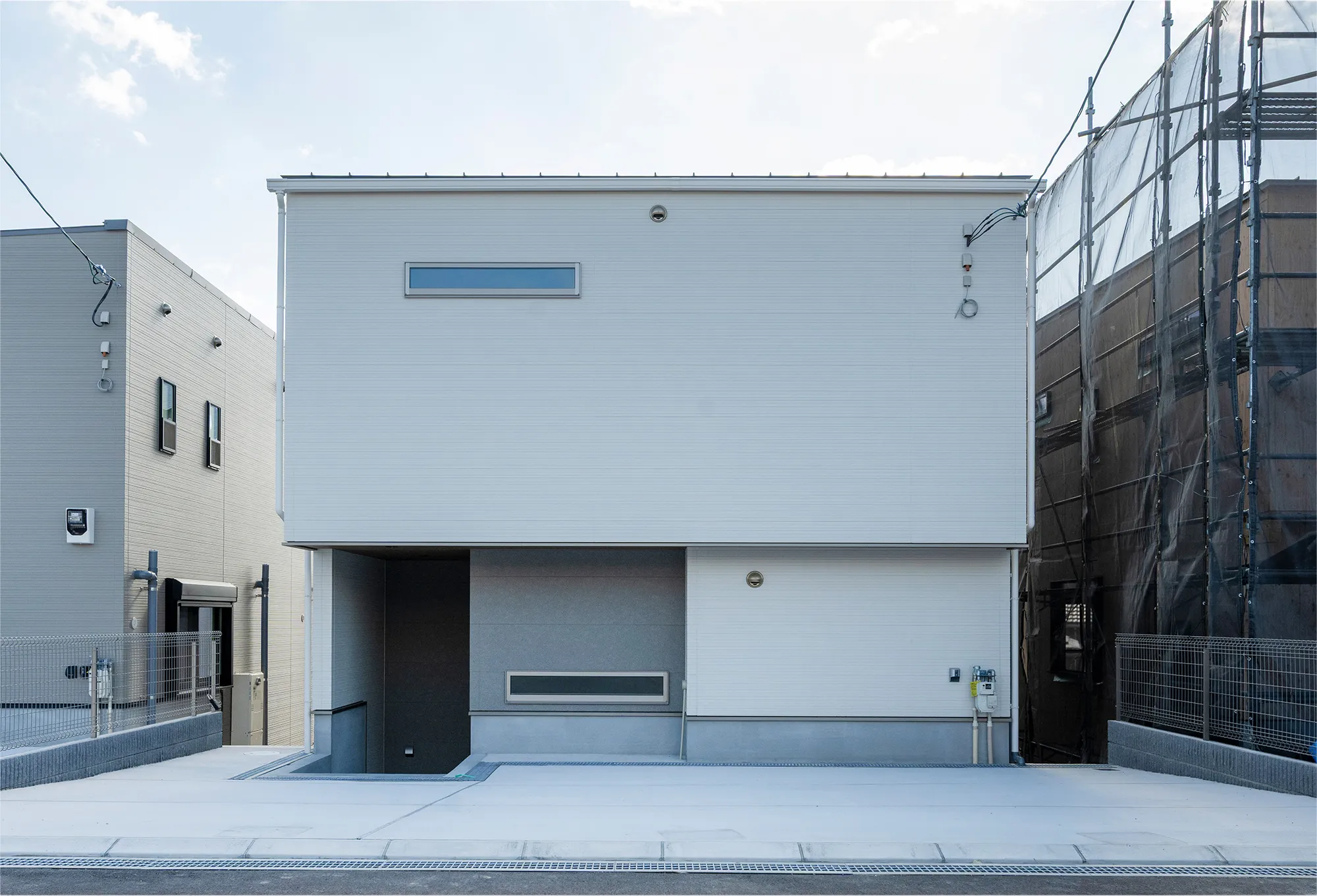 ホワイトとグレーのやさしい組み合わせの外観。矩形で構成されたシンプルモダンな雰囲気に仕上げました。