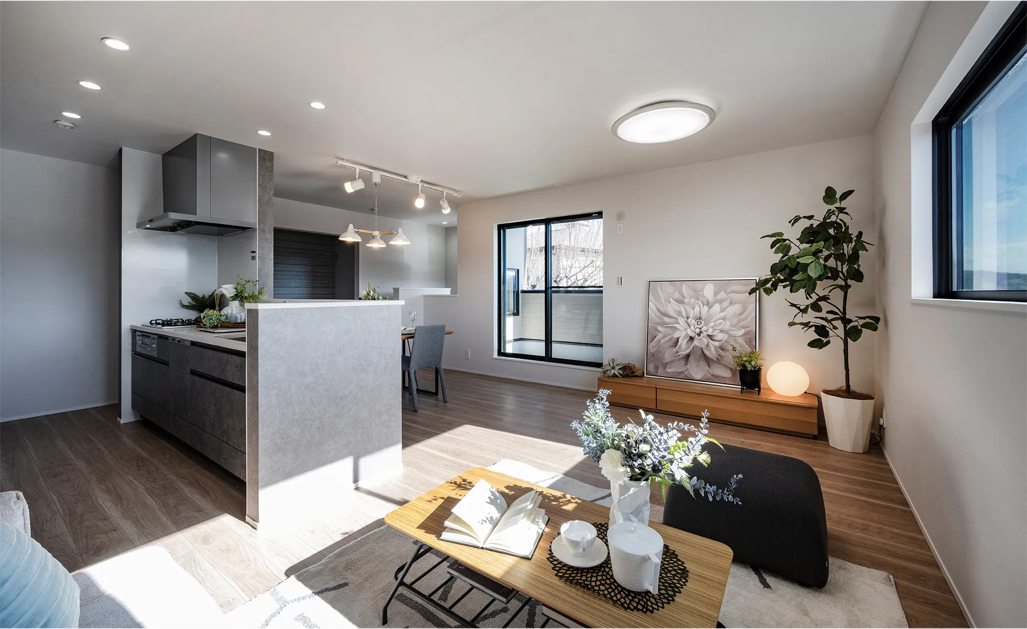バルコニーに面したダイニング。南窓の明るい光が差し込む開放的なリビング。アイランドキッチンで