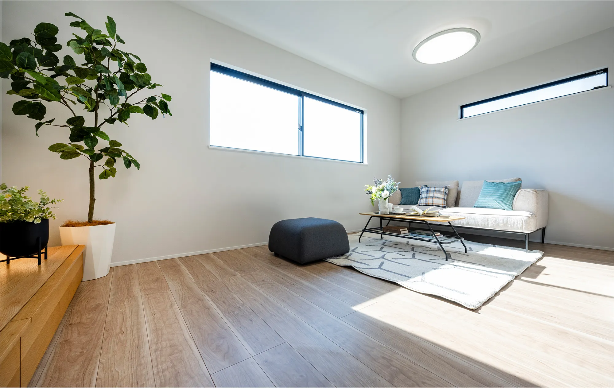 1月下旬、12時頃の光です。ひだまりに包まれたリビングで穏やかなひとときを過ごせます。