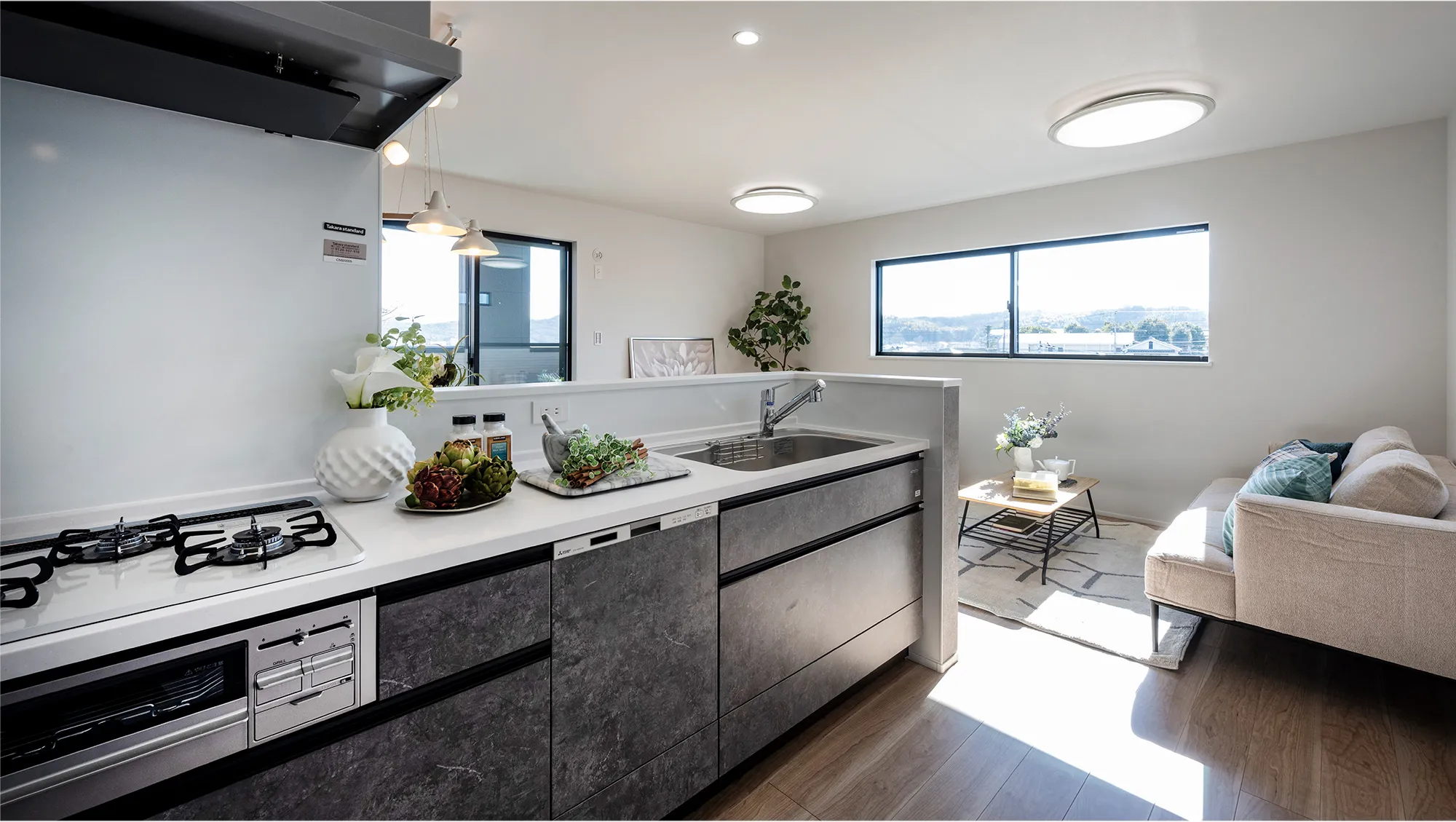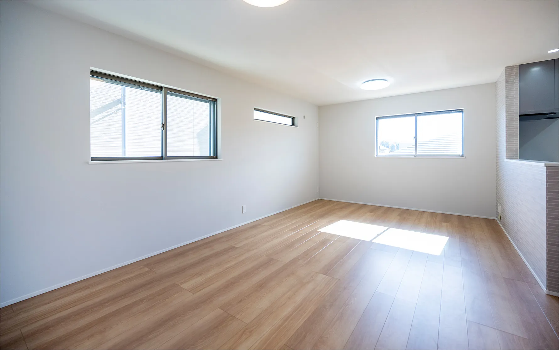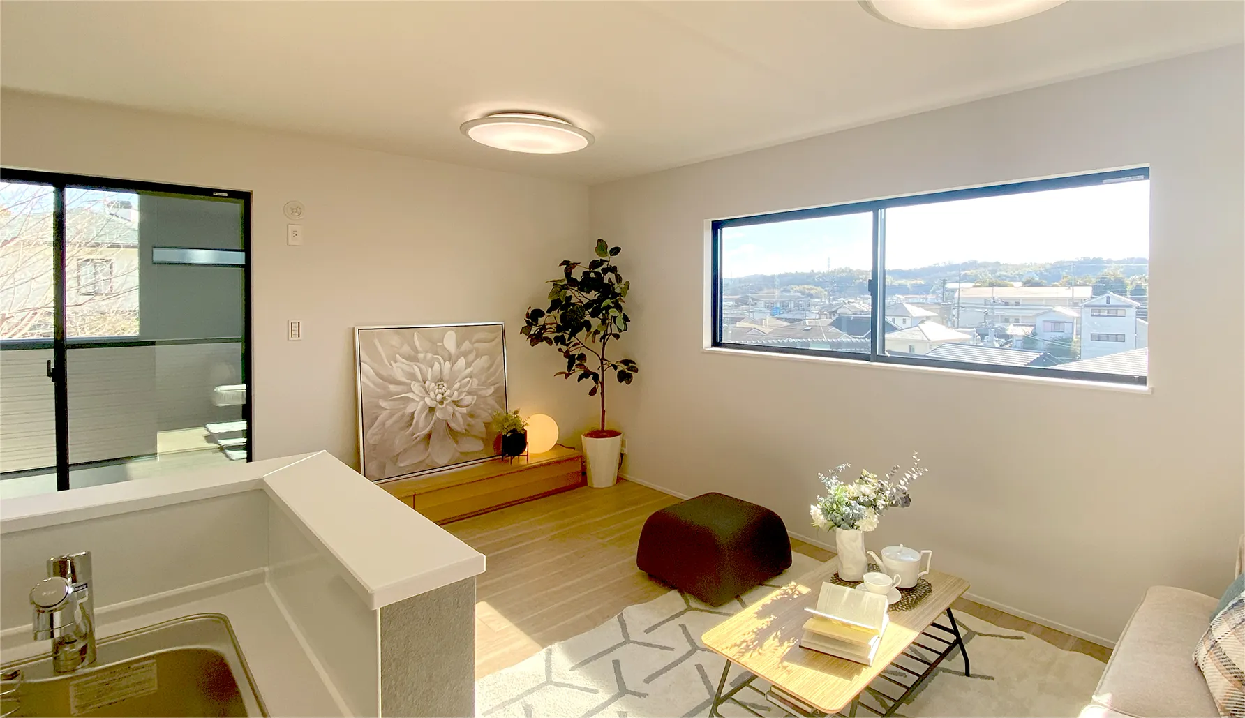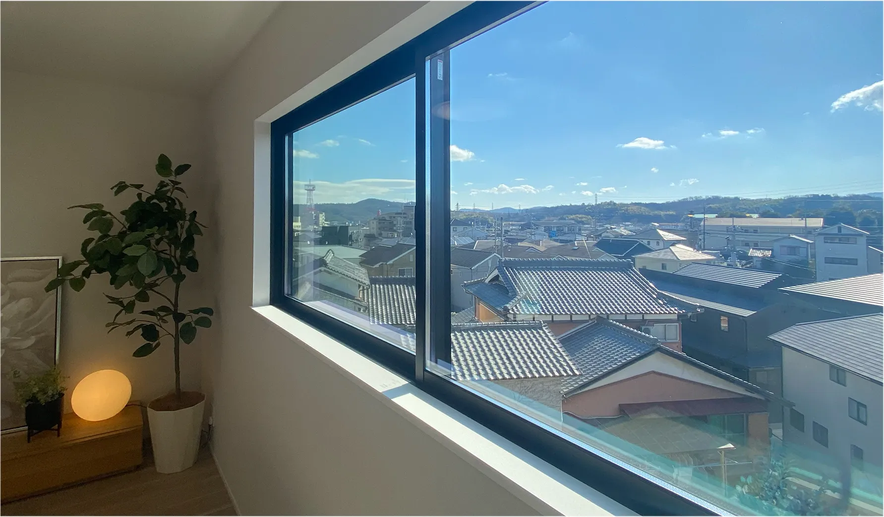 南東角地の恵まれた立地を生かしたLDKの窓設計。一番奥のワイドな南窓は、山並みと街並みが広がっています。