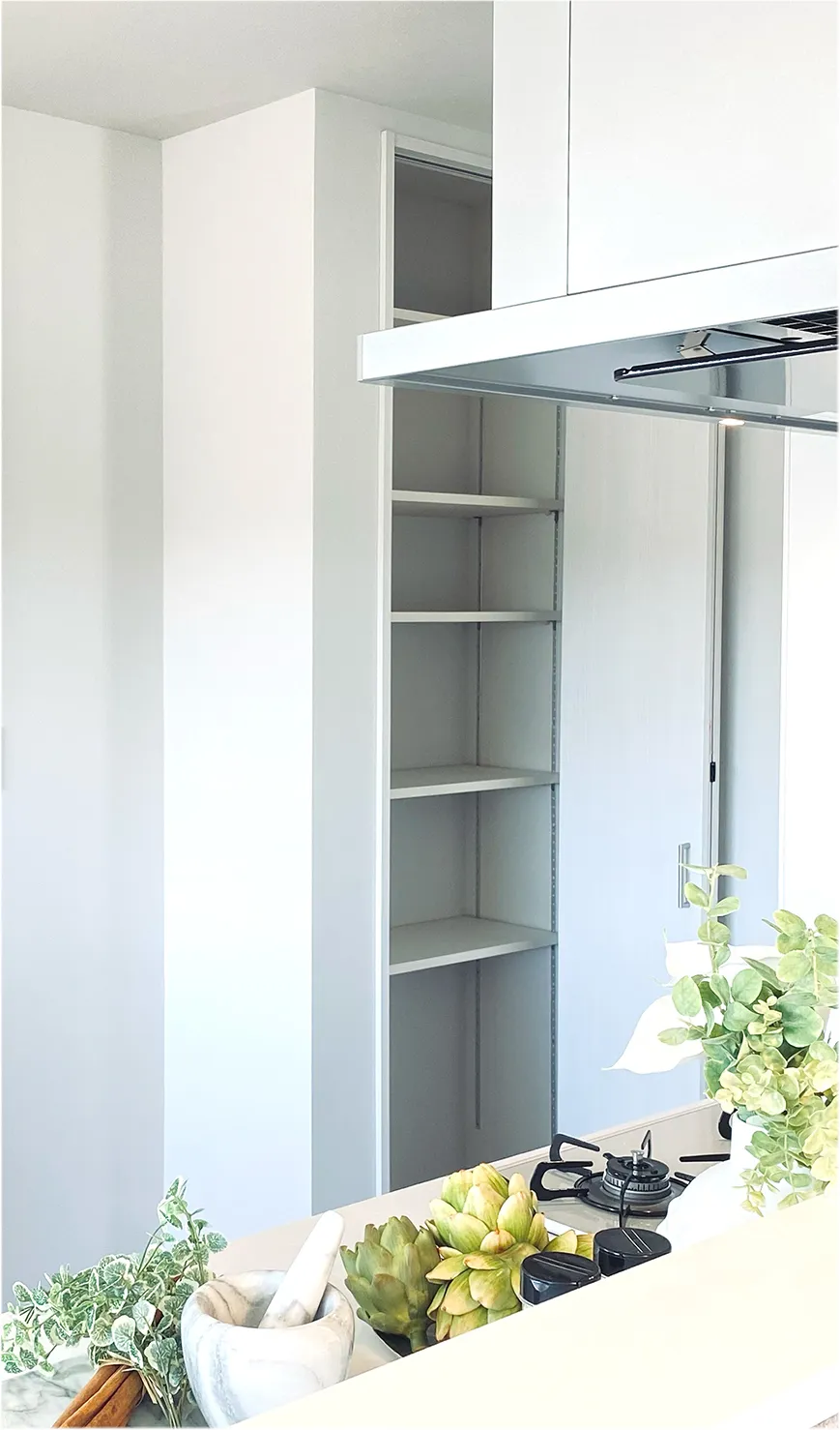 キッチン横にはパントリーも設置。散らかりがちなキッチンを美しく保てます。