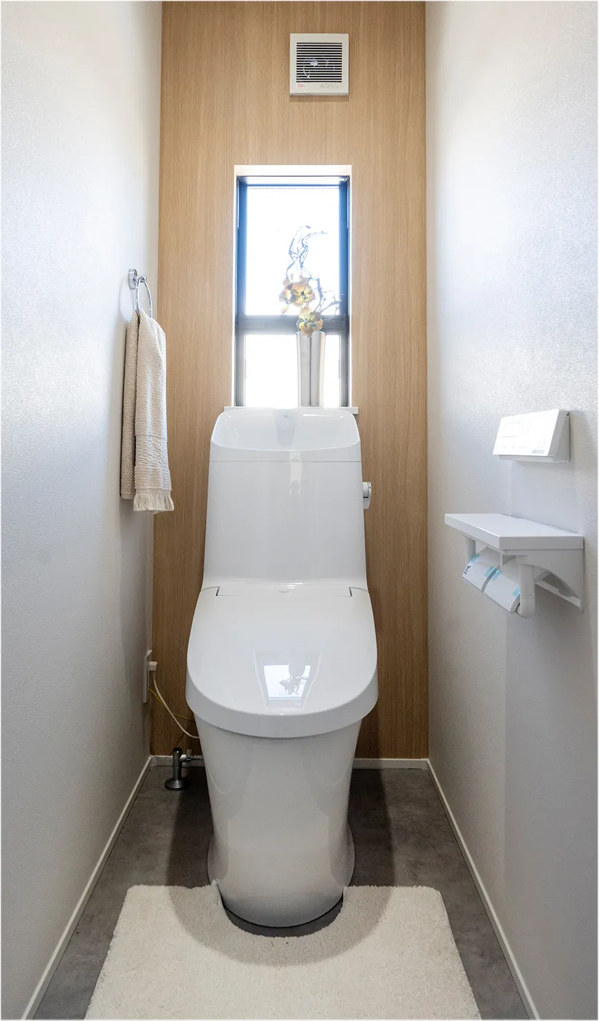 暖房便座、シャワートイレ機能を完備した窓付きトイレ。
