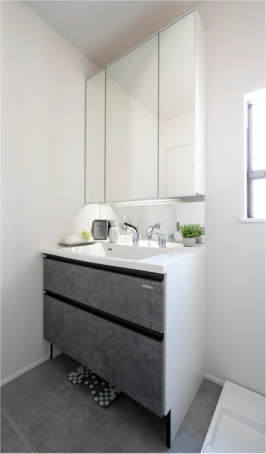 朝の身だしなみに便利な裏面収納付き三面鏡、シャワーノズル付き