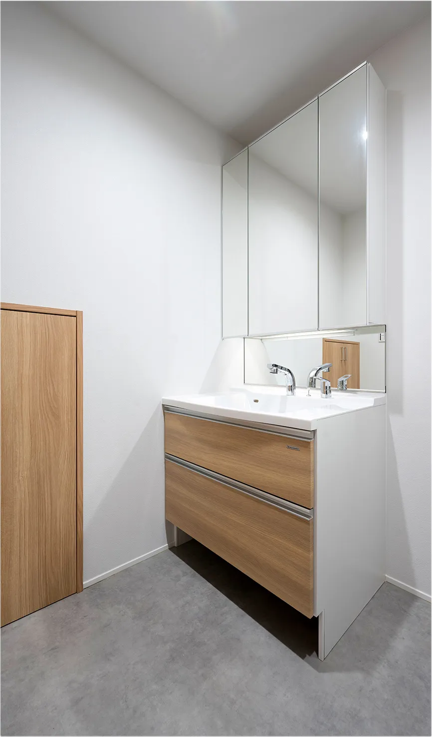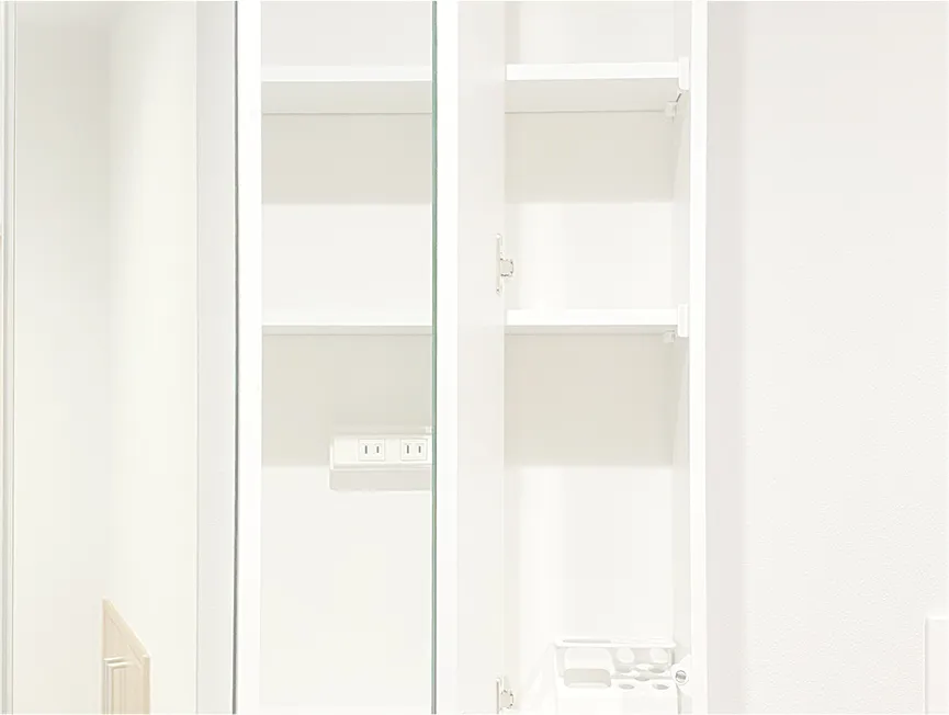身だしなみのお手入れに便利な3面鏡。その裏面は収納スペース。