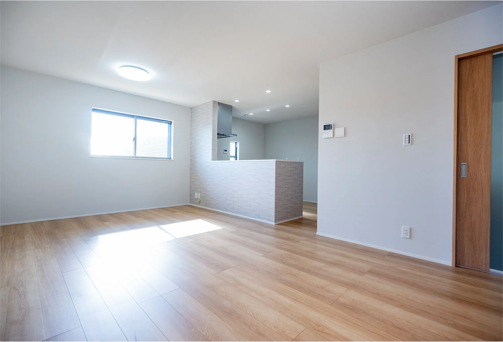 写真右に見えるドアは洗面室と浴室の水回り空間に繋がるドア。LDKとの独立性を高めています。