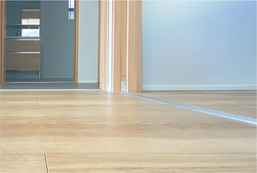 LDKと玄関、水回りの境界は段差をなくしたフラットフロア。