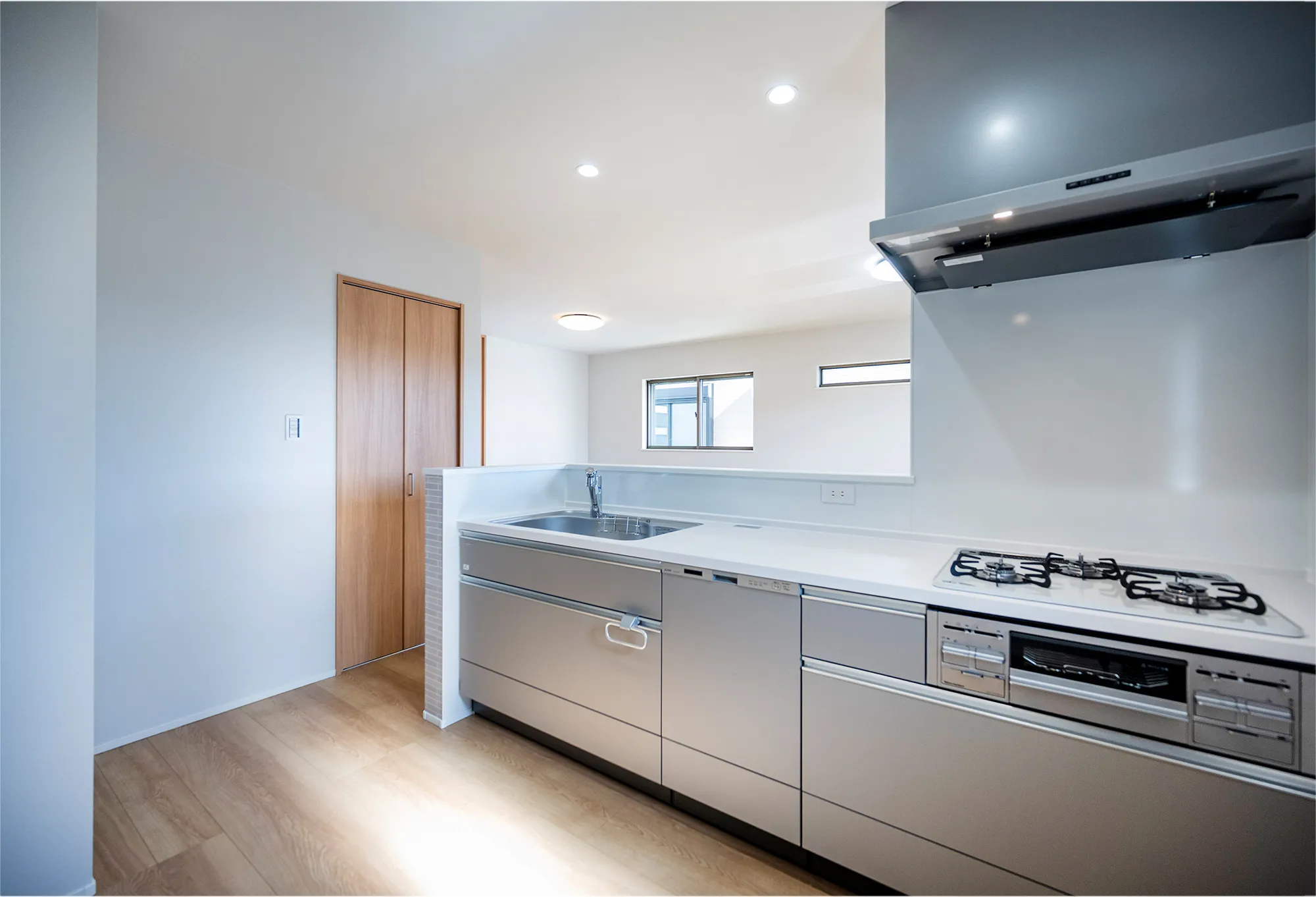 使用頻度の高いキッチン備品も整理できます。自動食器洗い乾燥機、三口コンロ、大型シンク、シャワーノズル付き混合水栓も標準装備。