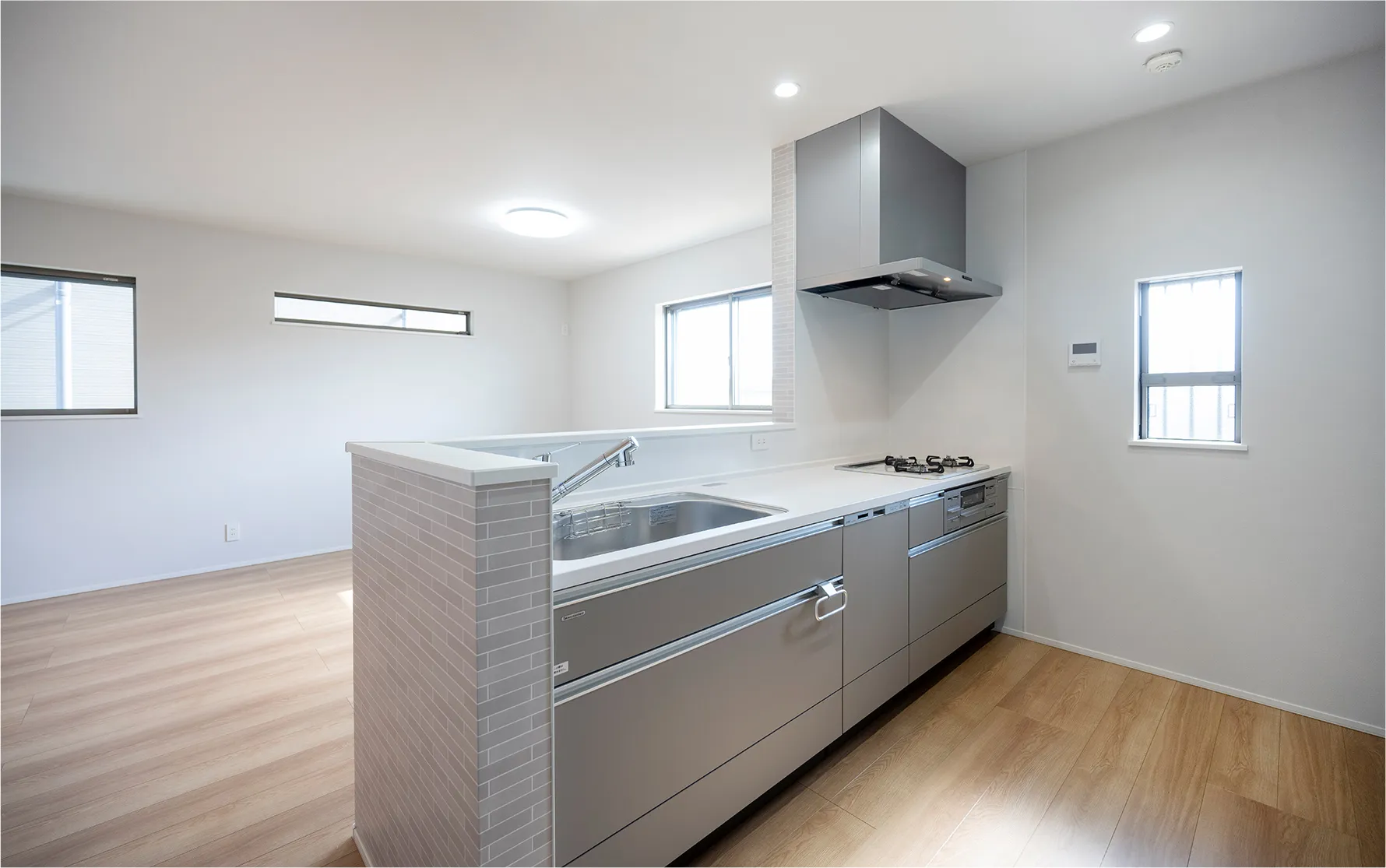 18.7帖のLDK内にアイランドキッチンを採用。ガスコンロ周辺と、シンクと作業スペースに手元隠しの壁を設けています。