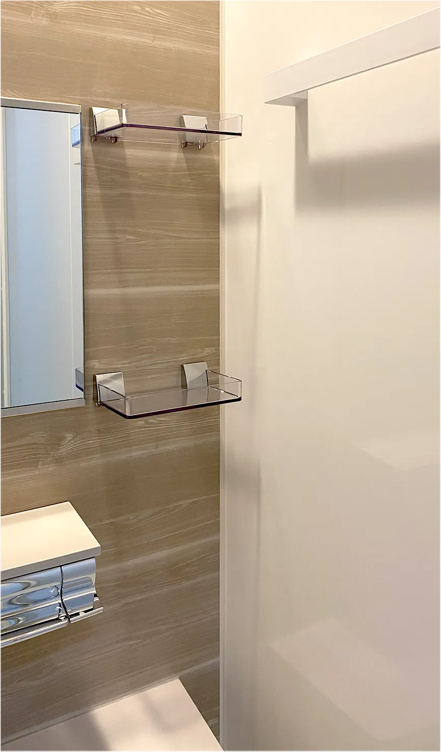 タオル掛けや棚を各種をご用意。シャンプーやシェーバーなど