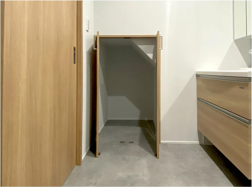洗面室の壁面収納。洗剤のストックなど保管に便利です。