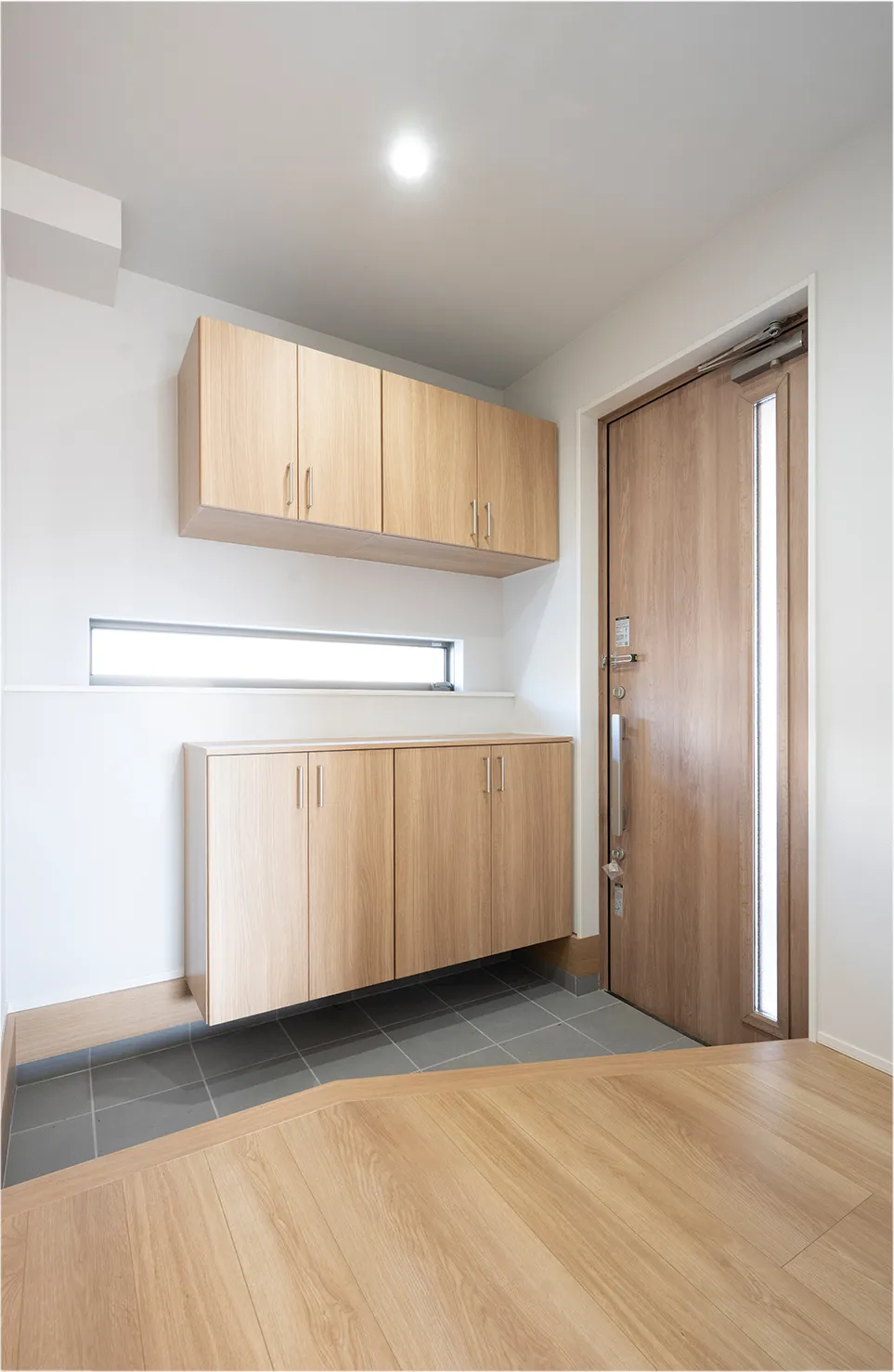 玄関は、壁とドアにスリット窓を設け採光性を確保。